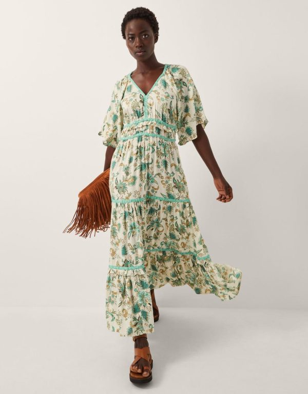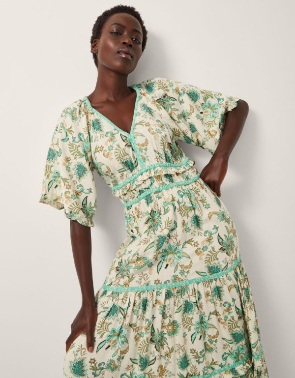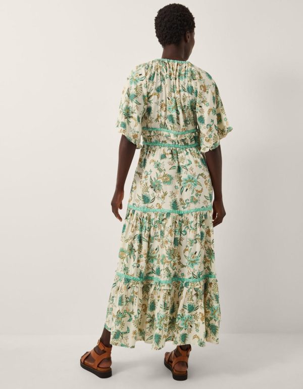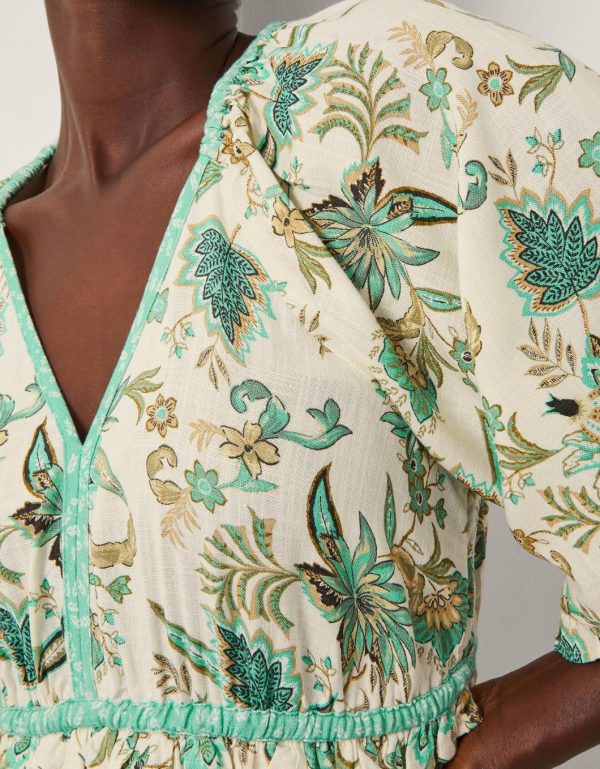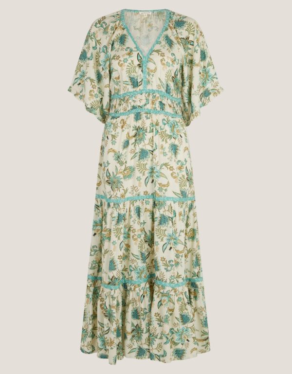 Sunshine uniform. Perfect for summer soirees and laidback weekends spent under blue skies,this dress is a piece of printed perfection. Designed with billowy short sleeves,a v-neckline and tiering midi-length hem,it’s patterned with artistic floral motifs in dreamy turquoise hues. Ivory
