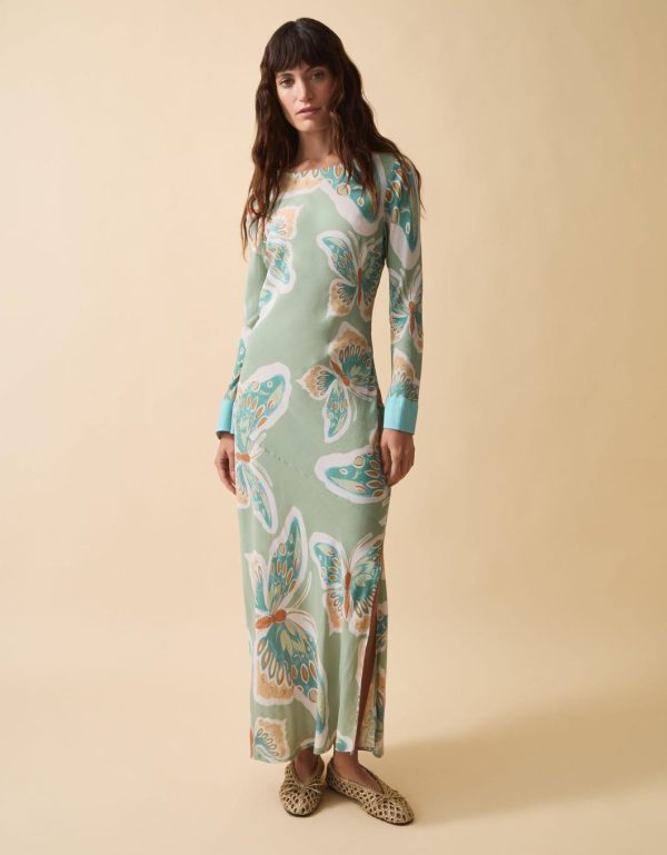The product: Social butterfly. A boheme dream,this dress showcases a simple silhouette with hand-painted butterfly motifs fluttering from shoulder to ankle. Let the dress do the talking and slide on barely-there heels with nothing else.