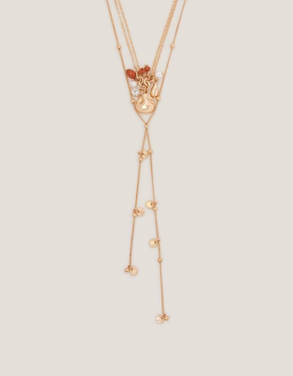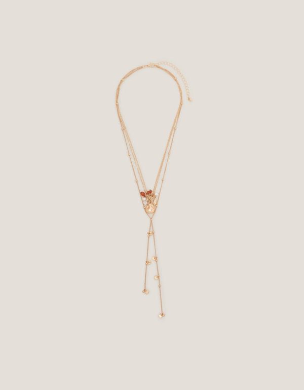 Charmed,i’m sure. Dipped in a golden tone,this necklace creates a luxe layered look of delicate chains,dainty coin pendants and a cluster of bead,pearl and diamanté charms. Finished with a lobster clasp fastening and extender.