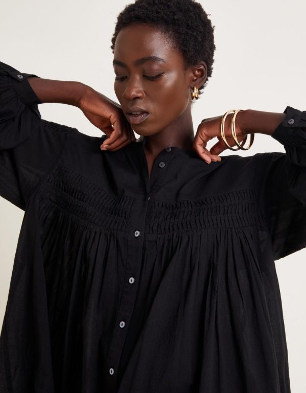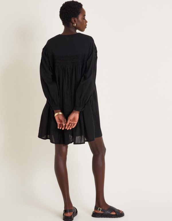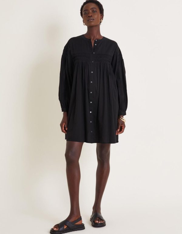 Keep your cool. Perfect for all-occasion summer dressing,this long sleeve smock dress features front button fastenings and a floaty mini-length hem. Finished with ruched top details and blouson sleeves. Black