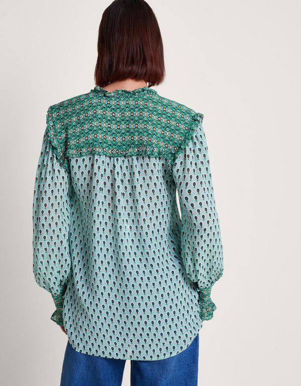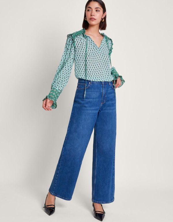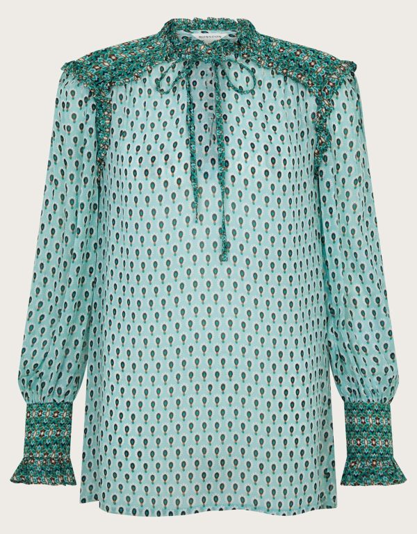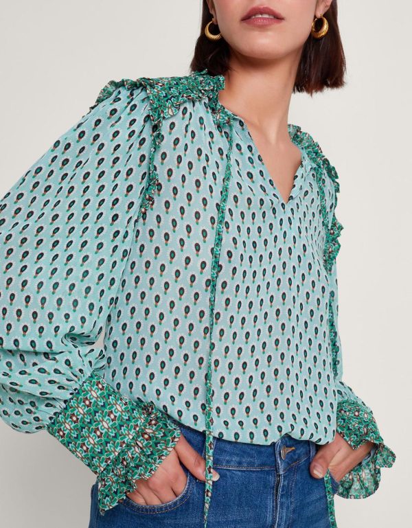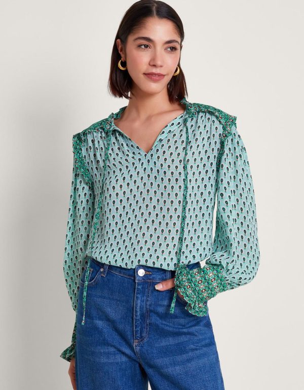Hi,it’s me… Your next blouse! This pretty-in-print blouse is designed with a paisley-style print with contrast detailing to the shoulders and cuffs. Finished with a tie neckline and ruffle detailing.